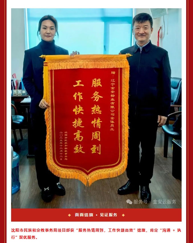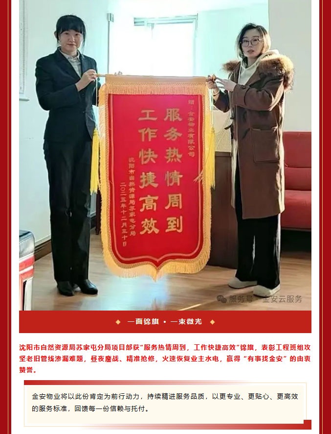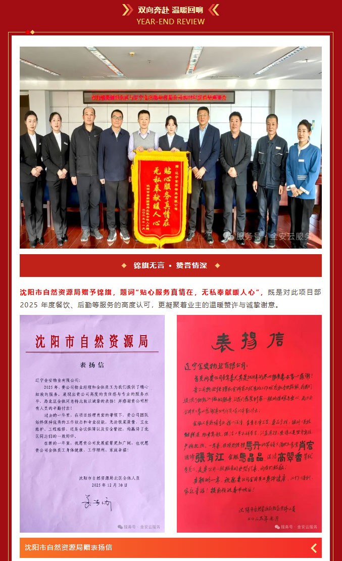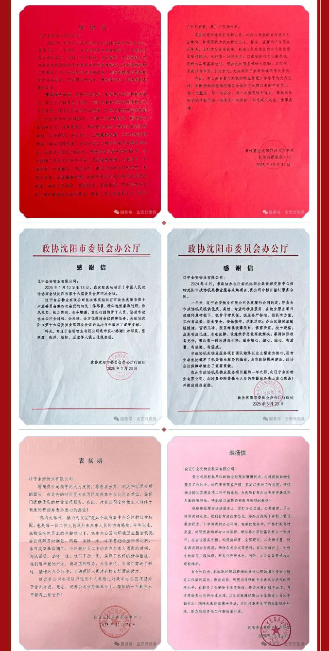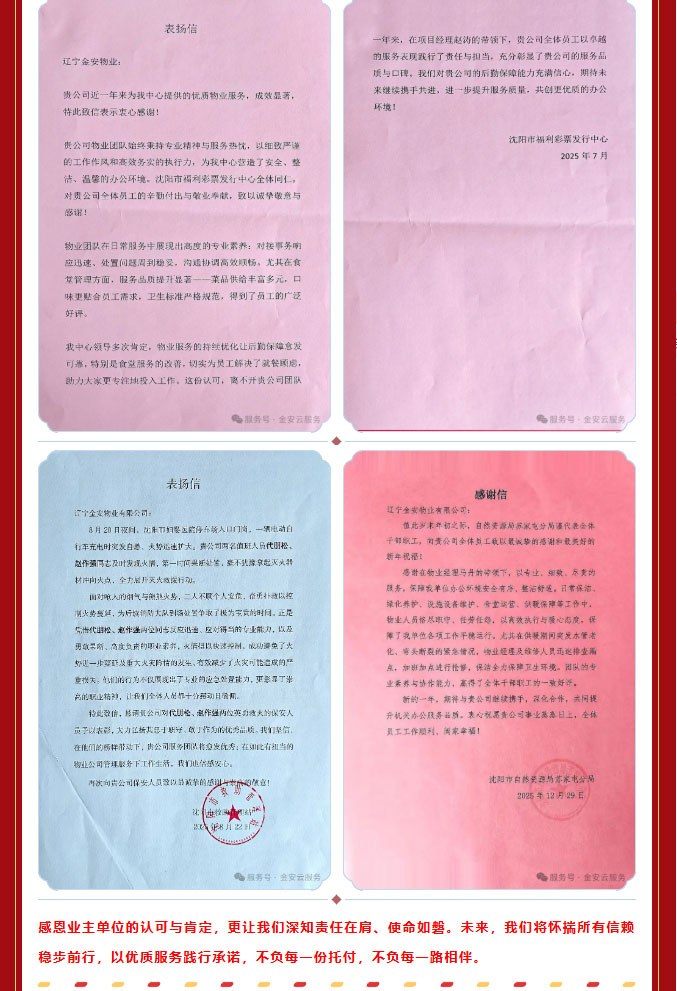 一面锦旗,映见初心坚守;一封尺牍,饱含赤诚信赖。回望2025年金安物业的服务征程,荣誉的版图从未凭空铸就,而是由无数次精准响应的迅捷、日复一日的执着坚守铺就,更由一封封情真意切的表扬信、一面面镌刻赞誉的锦旗,共同勾勒出最动人的轨迹。这些承载认可的信物,并非遥不可及的荣光,而是落在日常点滴间的服务担当——是维修师傅闻令而动的坚实脚步,是会议人员周全妥帖的悉心陪伴,是保洁团队润物无声的细致打理,是食堂班组三餐不辍的暖心烹饪,是安保人员风雨无阻的坚毅值守。每一份付出皆为微光,聚沙成塔,终成照亮信赖之路的璀璨星河。