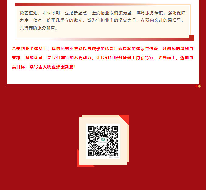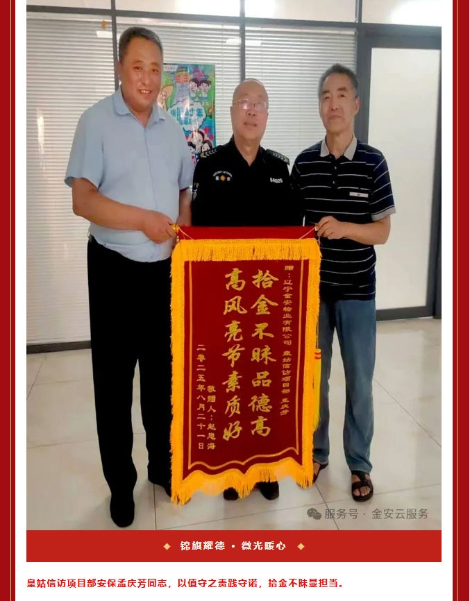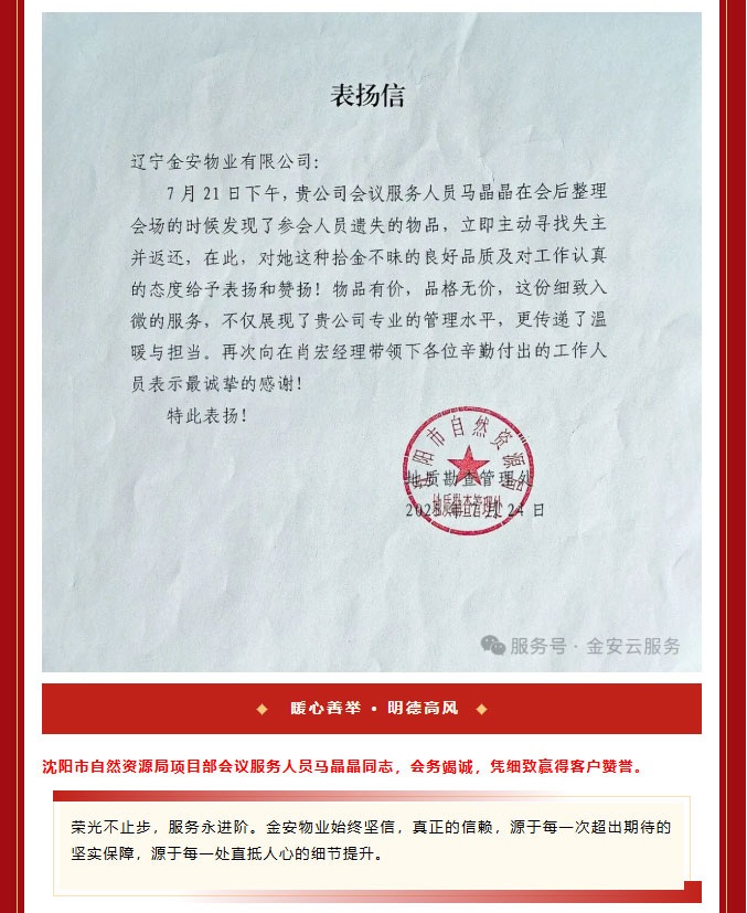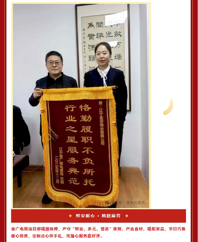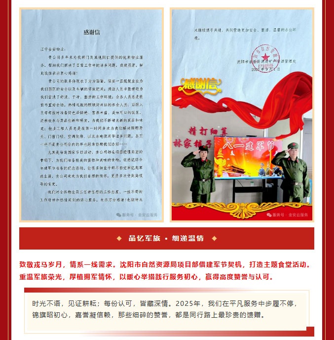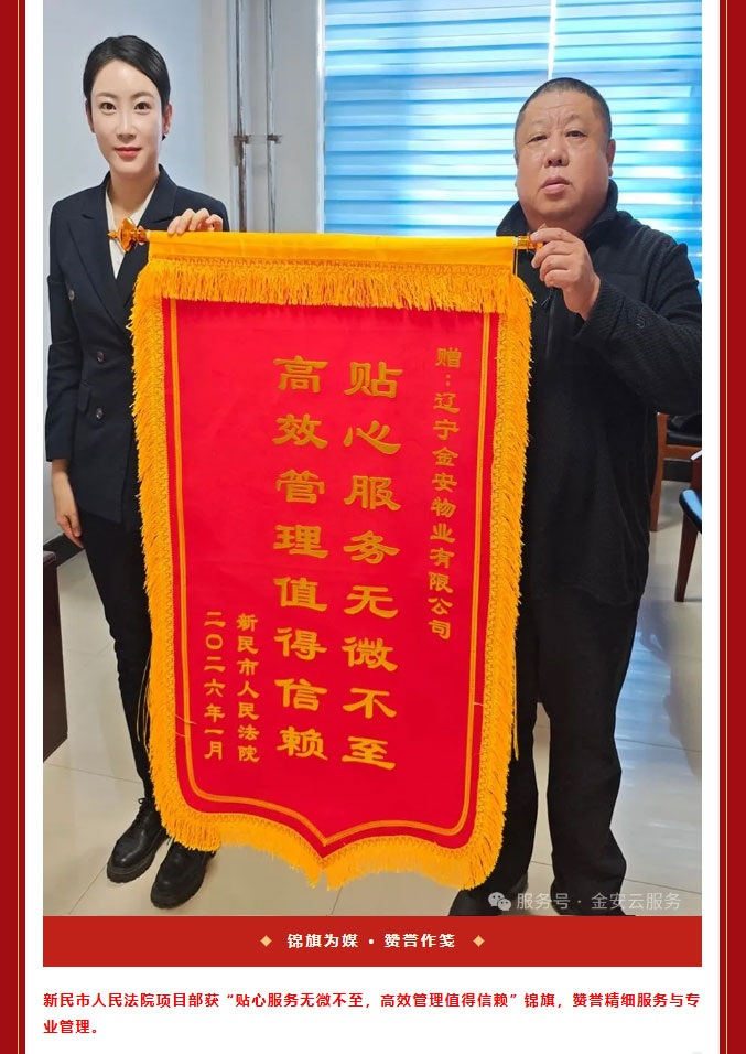 一面锦旗,映见初心坚守;一封尺牍,饱含赤诚信赖。回望2025年金安物业的服务征程,荣誉的版图从未凭空铸就,而是由无数次精准响应的迅捷、日复一日的执着坚守铺就,更由一封封情真意切的表扬信、一面面镌刻赞誉的锦旗,共同勾勒出最动人的轨迹。这些承载认可的信物,并非遥不可及的荣光,而是落在日常点滴间的服务担当——是维修师傅闻令而动的坚实脚步,是会议人员周全妥帖的悉心陪伴,是保洁团队润物无声的细致打理,是食堂班组三餐不辍的暖心烹饪,是安保人员风雨无阻的坚毅值守。每一份付出皆为微光,聚沙成塔,终成照亮信赖之路的璀璨星河。