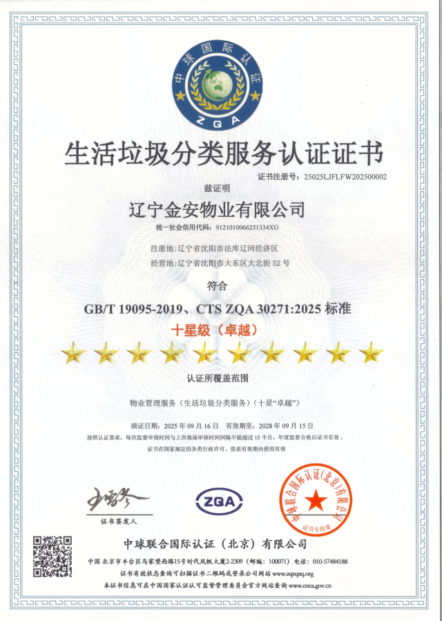 生活垃圾分类服务认证证书